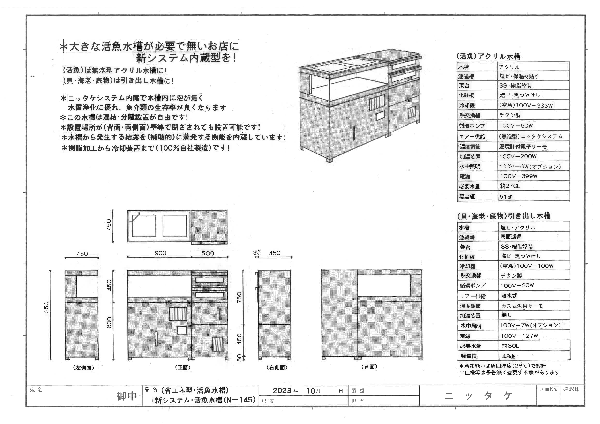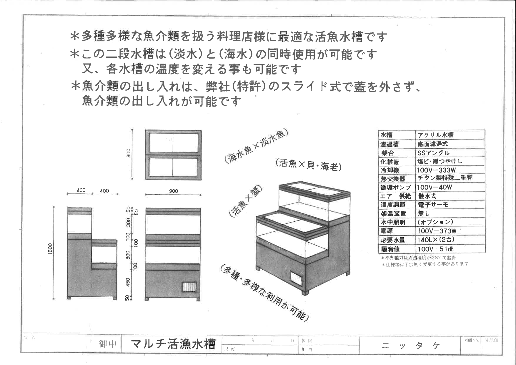 | (寸法)W900×D600×H850 (水槽)W900×D600×H200 (化粧板)塩ビ・黒つやけし (エアー供給)散水式 (冷却機)(空冷)100V-333W (循環ポンプ)100V-45W (温度調節)ガス式汎用サーモ (使用温度)15℃±2℃ (電源)100V-378W (必要水量)約100L (魚介類容器)パンチング樹脂製(4個) (水槽用フタ)閉店後使用 ※加温装置は内蔵していません。 |